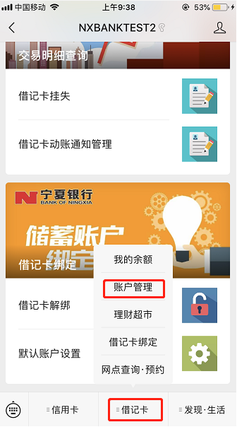 已持卡客戶,關(guān)注“寧夏銀行微銀行”公眾號,點(diǎn)擊底部菜單欄“借記卡”,選擇賬戶管理;