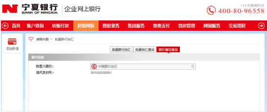 上傳文件內(nèi)的現(xiàn)代支付號(hào),可以在標(biāo)簽頁(yè)“銀行編號(hào)查詢(xún)”里查到,在下圖頁(yè)面里首先選擇收款銀行,在下面彈出的網(wǎng)點(diǎn)下拉框里選中網(wǎng)點(diǎn),最下方會(huì)自動(dòng)彈出所選銀行的現(xiàn)代支付號(hào)。