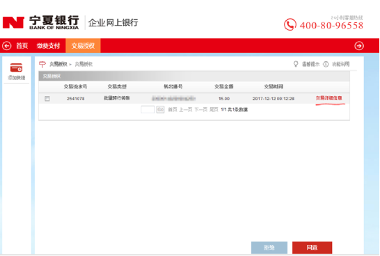 6、用企業(yè)審核員用戶(hù)登錄網(wǎng)銀系統(tǒng),進(jìn)入菜單“交易授權(quán)->交易授權(quán)”,點(diǎn)擊交易類(lèi)型為“批量轉(zhuǎn)賬”記錄的最后列“交易詳細(xì)信息”,查看交易詳細(xì)信息,然后點(diǎn)擊“返回”;